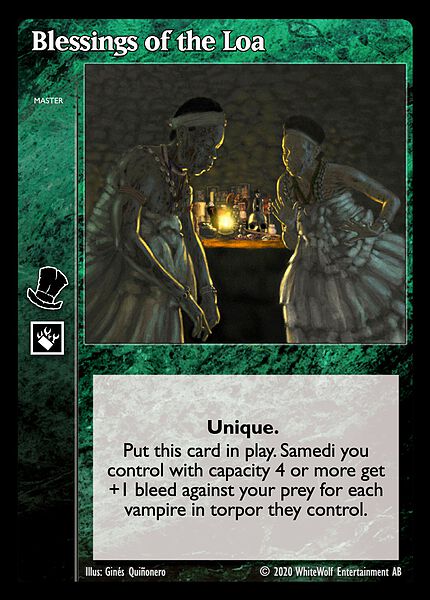 Nowa, niegrana karta Blessings of the Loa Vampire the Eternal Struggle z dodatku, w ktorym byla obecna.