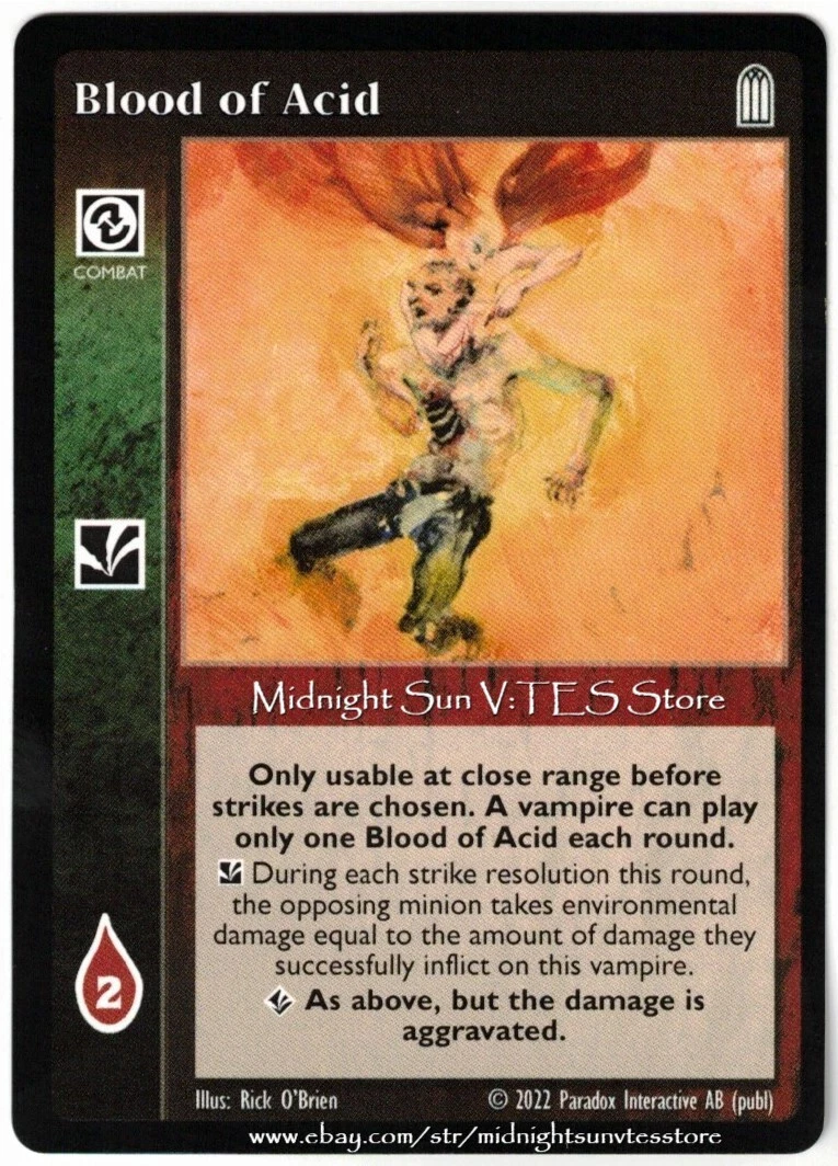 Nowa, niegrana karta Blood of Acid Vampire the Eternal Struggle z dodatku, w ktorym byla obecna.