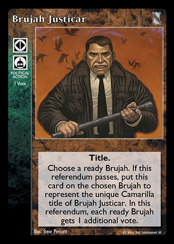Nowa, niegrana karta Brujah Justicar Vampire the Eternal Struggle z dodatku, w ktorym byla obecna.