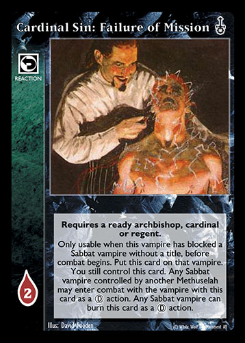 Nowa, niegrana karta Cardinal Sin: Failure of Mission Vampire the Eternal Struggle z dodatku, w ktorym byla obecna.