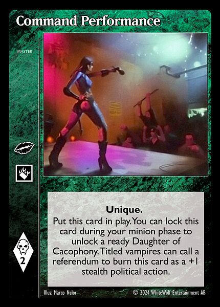 Nowa, niegrana karta Command Performance Vampire the Eternal Struggle z dodatku, w ktorym byla obecna.