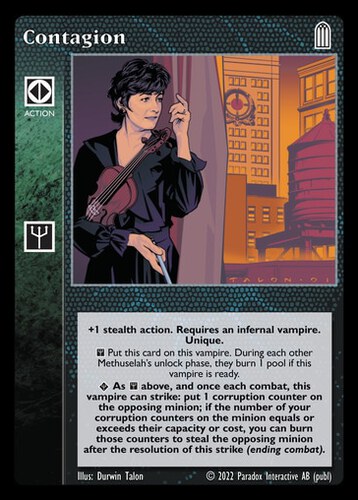 Nowa, niegrana karta Contagion Vampire the Eternal Struggle z dodatku, w ktorym byla obecna.