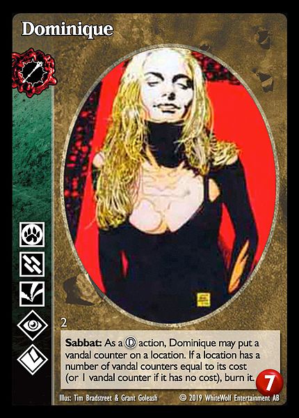 Nowa, niegrana karta Dominique Vampire the Eternal Struggle z dodatku, w ktorym byla obecna.