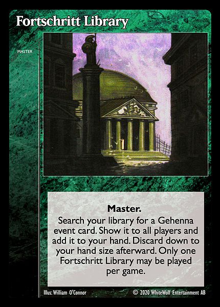 Nowa, niegrana karta Fortschritt Library Vampire the Eternal Struggle z dodatku, w ktorym byla obecna.