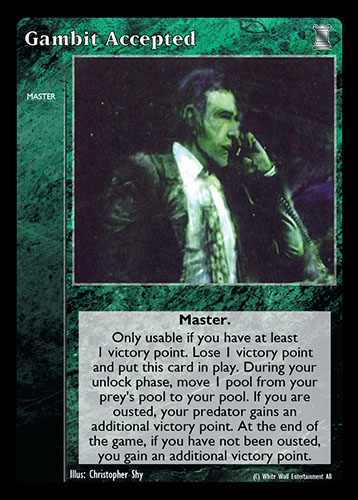 Nowa, niegrana karta Gambit Accepted Vampire the Eternal Struggle z dodatku, w ktorym byla obecna.