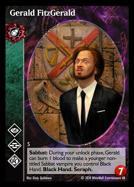 Nowa, niegrana karta Gerald FitzGerald Vampire the Eternal Struggle z dodatku, w ktorym byla obecna.