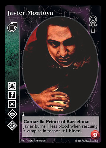 Nowa, niegrana karta Javier Montoya Vampire the Eternal Struggle z dodatku, w ktorym byla obecna.