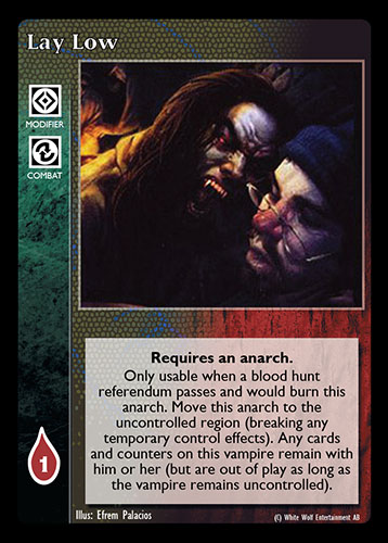 Nowa, niegrana karta Lay Low Vampire the Eternal Struggle z dodatku, w ktorym byla obecna.