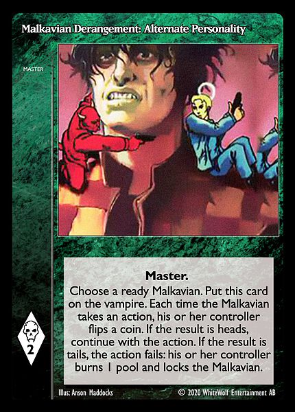 Nowa, niegrana karta Malkavian Derangement: Alternate Personality Vampire the Eternal Struggle z dodatku, w ktorym byla obecna.