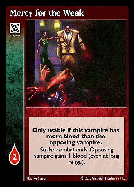 Nowa, niegrana karta Mercy for the Weak Vampire the Eternal Struggle z dodatku, w ktorym byla obecna.