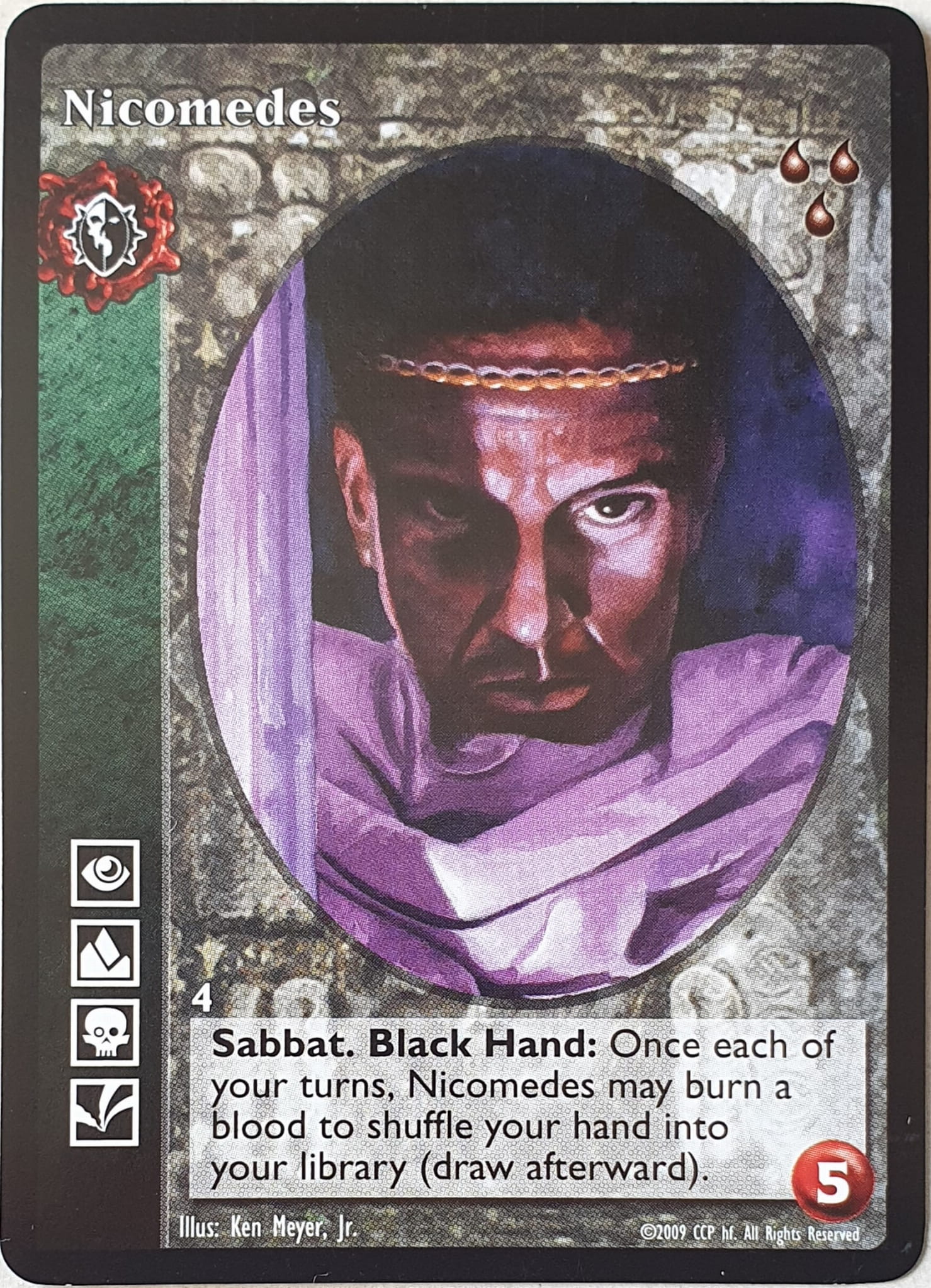 Nowa, niegrana karta Nicomedes Vampire the Eternal Struggle z dodatku, w ktorym byla obecna.