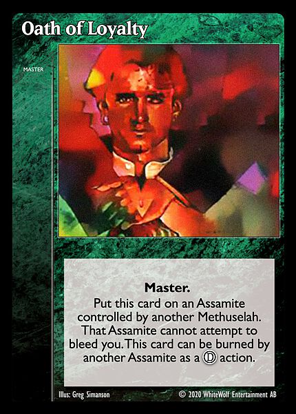 Nowa, niegrana karta Oath of Loyalty Vampire the Eternal Struggle z dodatku, w ktorym byla obecna.