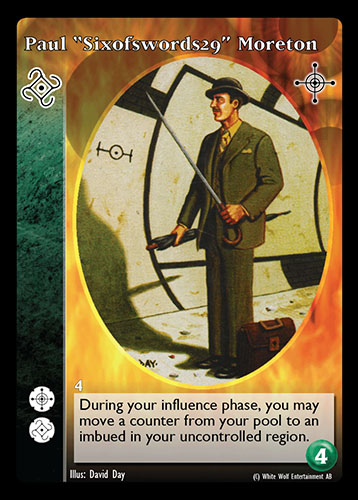 Nowa, niegrana karta Paul „Sixofswords29” Moreton Vampire the Eternal Struggle z dodatku, w ktorym byla obecna.