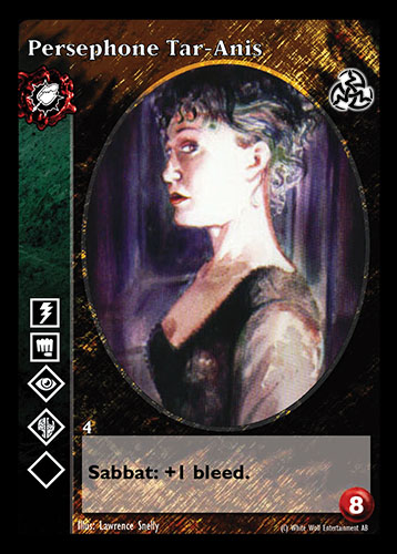 Nowa, niegrana karta Persephone Tar-Anis Vampire the Eternal Struggle z dodatku, w ktorym byla obecna.