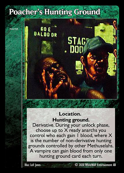 Nowa, niegrana karta Poacher’s Hunting Ground Vampire the Eternal Struggle z dodatku, w ktorym byla obecna.