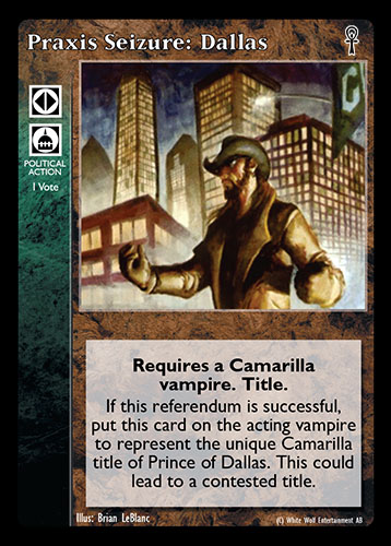Nowa, niegrana karta Praxis Seizure: Dallas Vampire the Eternal Struggle z dodatku, w ktorym byla obecna.