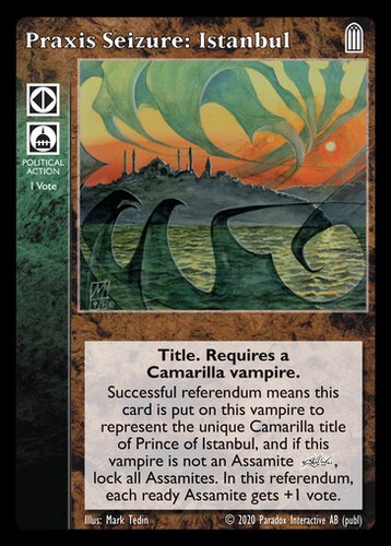 Nowa, niegrana karta Praxis Seizure: Istanbul Vampire the Eternal Struggle z dodatku, w ktorym byla obecna.