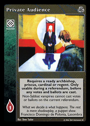 Nowa, niegrana karta Private Audience Vampire the Eternal Struggle z dodatku, w ktorym byla obecna.