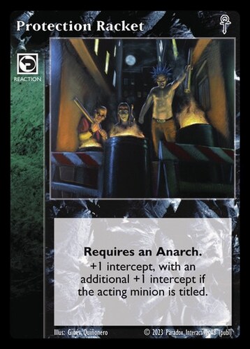 Nowa, niegrana karta Protection Racket Vampire the Eternal Struggle z dodatku, w ktorym byla obecna.