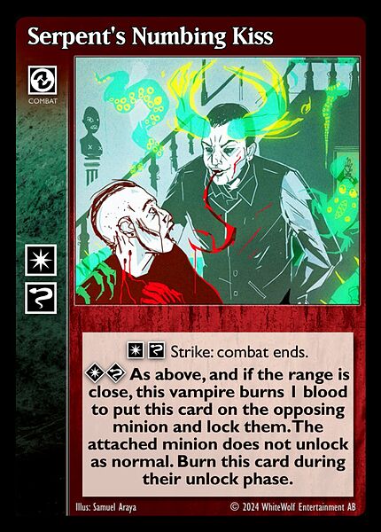 Nowa, niegrana karta Serpent’s Numbing Kiss Vampire the Eternal Struggle z dodatku, w ktorym byla obecna.