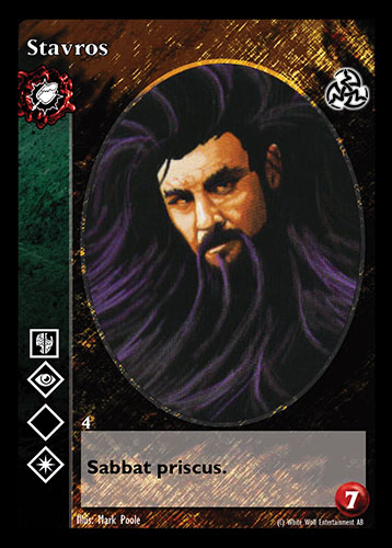 Nowa, niegrana karta Stavros Vampire the Eternal Struggle z dodatku, w ktorym byla obecna.