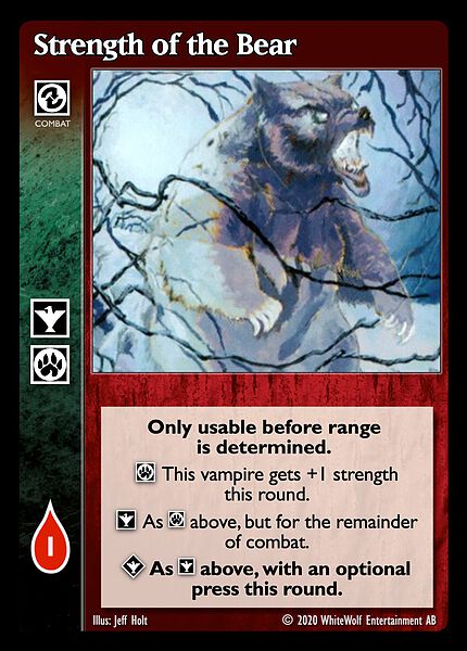 Nowa, niegrana karta Strength of the Bear Vampire the Eternal Struggle z dodatku, w ktorym byla obecna.