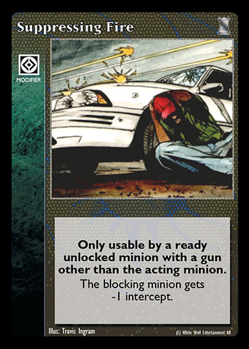 Nowa, niegrana karta Suppresing Fire Vampire the Eternal Struggle z dodatku, w ktorym byla obecna.