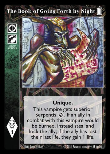 Nowa, niegrana karta The Book of Going Forth by Night Vampire the Eternal Struggle z dodatku, w ktorym byla obecna.