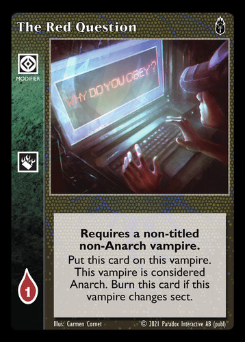 Nowa, niegrana karta The Red Question Vampire the Eternal Struggle z dodatku, w ktorym byla obecna.