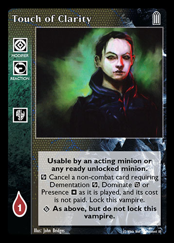 Nowa, niegrana karta Touch of Clarity Vampire the Eternal Struggle z dodatku, w ktorym byla obecna.