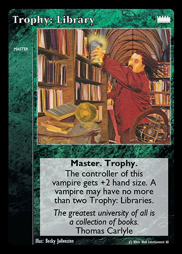 Nowa, niegrana karta Trophy: Library Vampire the Eternal Struggle z dodatku, w ktorym byla obecna.