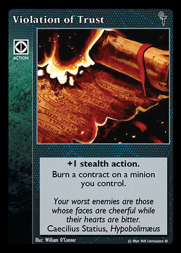 Nowa, niegrana karta Violation of Trust Vampire the Eternal Struggle z dodatku, w ktorym byla obecna.